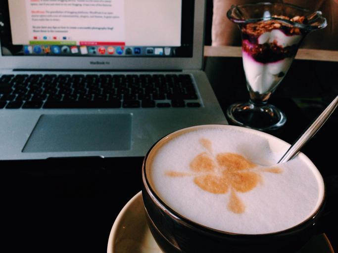 Keywords: coffee macbook air laptop computer technology business working lunch latte,
