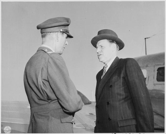 | Keywords: Col. Maurry Jones, Commanding Officer of American Operations at Gatow Airport, Berlin, Germany, greets Mr. Robert... - NARA - 199005.jpg Scope and content General notes 199005 Local identifier National Archives and Records Administration Office of Presidential Libraries Harry S Truman Library 04/01/1985 - Harry S Truman Library NLHST 500 West U S Highway 24 Independence MO 64050-1798 1945-07-15 Record group Collection HST-AVC Audiovisual Collection 1957 - 2006 Record group ARC 1207 Photographs Relating to the Administration Family and Personal Life of Harry S Truman compiled 1957 - 2004 documenting the period 1849 - 2004 Series ARC 198606 File unit File unit ARC Variant control numbers NAIL Control Number NLT-AVC-PHT-63 1457 75 Other versions <gallery> File Col _Maurry_Jones _Commanding_Officer_of_American_Operations_at_Gatow_Airport _Berlin _Germany _greets_Mr _Robert _-_NARA_-_199005 tif tif File Col _Maurry_Jones _Commanding_Officer_of_American_Operations_at_Gatow_Airport _Berlin _Germany _greets_Mr _Robert _-_NARA_-_199005 jpg jpg </gallery> NARA-cooperation PD-USGov United States Department of State Gatow air field Robert Daniel Murphy |