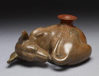 | Keywords: Colima - Dog Effigy Vessel - Walters 20092063 - View A.jpg  Among the Mexica Aztecs of highland Mexico dogs were associated with the deity Xolotl the god of death This deity and a dog were believed to lead the soul on its journey to the underworld The Mexica also associated Xolotl with the planet Venus as the evening star portrayed with the head of a canine and the twin brother of the deity Quetzalcóatl who personified Venus as the morning star The dog's special relationship with humans is highlighted by a number of Colima dog effigies wearing humanoid masks This curious effigy type has been interpreted as a shamanic transformation image or as a reference to the modern Huichol myth of the origin of the first wife who was transformed from a dog into a human However recent scholarship suggests a new explanation of these sculptures as the depiction of the animal's tonalli its inner essence which is made manifest by being given human form via the mask The use of the human face to make reference to an object's or animal's inner spirit is found in the artworks of many ancient cultures of the Americas from the Inuit of Alaska and northern Canada to peoples in Argentina and Chile The reclining dog has seemingly just woken slightly raising its head and perking up its ears in reaction to whatever disturbed its slumber The artist skillfully modeled its body especially the muscles and skeletal features 100 BC-AD 300 earthenware burnished slip paint in red and light brown H 5 5/8 x L 12 3/16 x W 10 15/16 in 14 3 x 30 9 x 27 8 cm accession number 2009 20 63 80218 David Stuart Gallelries date and mode of acquisition unknown John G Bourne 1980s by purchase Walters Art Museum Gift of John Bourne 2009 place of origin Colima Mexico Walters Art Museum license Objects from Colima in the Walters Art Museum Media contributed by the Walters Art Museum needs category review Dogs in Pre-Columbian art |