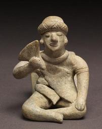 | Keywords: Colima - Group of Figurines and Architectural Model - Walters 20092033 (2) (3).jpg Narrative groupings of figurines in architectural settings have been found throughout Mesoamerica in contexts dating as early as the Middle Formative Period 900-400 BCE Some are made from jadeite and similar precious stones such as an Olmec ceremonial scene of sixteen figurines arranged in a semicircle and framed by six column-like celts Others are composed of modeled ceramic figures depicting a burial or ancestor veneration rite complete with elaborately dressed performers and musicians like that found above Tomb 103 at Monte Albán Oaxaca The objects that constitute these figure groups generally share the same aesthetic style and manufacturing technique which suggests they were made at the same time as a single artistic statement The disparate artistic styles and technical features suggest that these nine Colima figurines and one building model might be a modern grouping although dissimilar figurines have been documented in figure groupings found in the same tomb In this instance archaeological confirmation is not available The figurine types represent at least two styles from Colima-Jalisco including the Tuxcacuesco-Ortices type nos 33 3 33 8 and 33 9 and two from the Colima-Jalisco border region nos 33 4 and 33 5 The house model no 33 1 depicts a typical West Mexican domicile or ceremonial building without its basal earthen platform No architecture of comparable form is found in the region because these structures were made of perishable materials; only the earth-and-stone platforms have survived although many have been destroyed by modern agricultural activities These architectural models thus document the lost architectural heritage of ancient West Mexico The figures portray men and women performing both ritual and daily activities from mothers tending children nos 33 3 and 33 8 and grinding maize no 33 7 to men drumming no 33 6 or sitting regally and brandishing a fanlike scepter no 33 9 A seated hunchback figure which also is a whistle sports an elaborate head wrap and fine jewelry no 33 10 A dog-standing-atop-a-dog sculpture and two seated men with elongated heads complete the group nos 33 2 33 4 and 33 5 This elongated-head figurine style is associated with the northern Colima-Jalisco region and dates to the later years of the Comala phase ca 200-300 CE 200 BC-AD 400 earthenware 1 cm 16 9 13 1 13 7 ; 2 H 3 3/4 x L 3 13/16 x W 2 1/16 in 9 5 x 9 7 x 5 3 cm ; 3 cm 10 3 7 7 4 8 ; 4 cm 7 1 4 1 2 3 ; 5 cm 7 3 4 7 2 3 ; 6 cm 9 1 6 2 6 3 ; 7 cm 14 6 7 8 12 7 ; 8 cm 12 1 8 4 5 5 ; 9 cm 8 9 6 9 10 1 ; 10 cm 7 5 1 5 2 accession number 2009 20 33 80188 John G Bourne date and mode of acquisition unknown Walters Art Museum Gift of John Bourne 2009 place of origin Colima Mexico <gallery> File Colima - Group of Figurines and Architectural Model - Walters 20092033 jpg File Colima - Group of Figurines and Architectural Model - Walters 20092033 2 jpg </gallery> Walters Art Museum license Objects from Colima in the Walters Art Museum Media contributed by the Walters Art Museum needs category review Colima ceramic figurines |