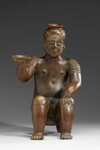 | Keywords: Colima - Seated Female Figure - Walters 20092053.jpg The Coahuayana River Valley was home to many large villages and towns and their artists produced a distinctive local version of the large hollow tomb figure Coahuayana figural art is characterized by elegant renderings of persons of authority Most portrayals lack individuality and instead serve as sculptural representations of social position or political rank This seated female's serene countenance shoulder scarification patterns necklace and pierced ears denote a person of high status The artist accentuated the figure with red slip enhancing her hair forearms and legs below the knee Her identification as a person of authority is further indicated by her sitting on a four-legged stool or bench; this type of seating was closely associated with elevated status throughout the ancient Americas She raises a small dish in her right hand as if proffering its contents to unseen persons perhaps participants in an aristocratic feasting event 100 BC-AD 300 earthenware burnished red slip paint with resist designs in black cm 49 5 30 5 24 8 accession number 2009 20 53 80208 Stendhal Galleries Los Angeles date and mode of acquisition unknown John G Bourne 1940s by purchase Walters Art Museum Gift of John Bourne 2009 place of origin Michoacán Mexico Walters Art Museum license Objects from Colima in the Walters Art Museum Media contributed by the Walters Art Museum needs category review |