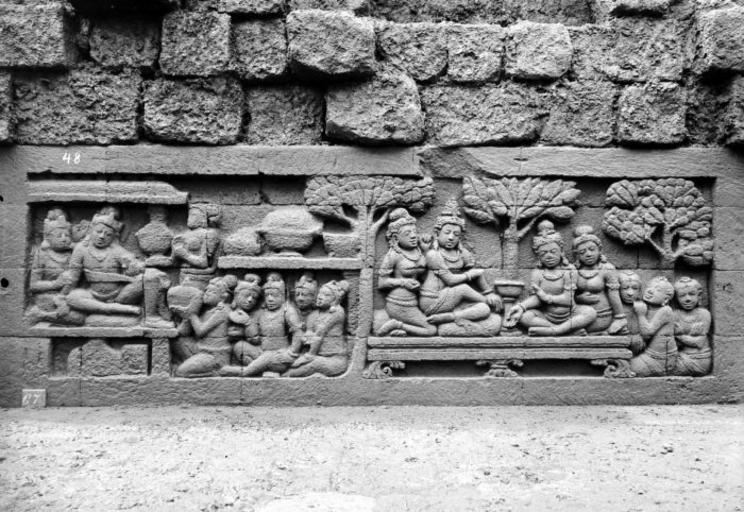 | Keywords: COLLECTIE TROPENMUSEUM Reliëf O 133 op de verborgen voet van de Borobudur TMnr 10015870.jpg nl Negatief Negatief waarop reliëf O 133 van de verborgen voet van de Borobudur te zien is De verborgen voet van de Borobudur is de oorspronkelijke basis van het Buddhistische heiligdom dat rond 800 gebouwd is In een latere fase van de bouw werd deze basis verborgen waarschijnlijk om verzakking te verkomen De verborgen voet loopt om het hele bouwwerk heen en bevat 160 reliëfs die tezamen de Mahakarmawibhangga verbeelden een Mahayanistische tekst die de werking van de leer van Karma uiteenzet Deze leerrede wordt aan Buddha toegeschreven en handelt over oorzaak en gevolg N J Krom en Th van Erp duiden in hun standaardwerk over de Borobudur Beschrijving van Barabudur Den Haag Martinus Nijhoff 1920-1931 de reliëfs van de verborgen voet aan als serie O Op de reliëfs zijn voorbeelden van de theorie uitgebeeld goede daden hebben goede gevolgen en slechte daden hebben slechte gevolgen De reliëfs vallen in twee delen uiteen O 1 tot en met O 117 verbeelden een aantal daden die leiden tot één en hetzelfde gevolg De reliëfs O 118 tot en met O 160 tonen verschillende gevolgen van één oorzaak De uiteenzetting van de leer begint bij de trap aan de oostzijde en ontrolt zich met de klok mee om het bouwwerk heen De reliëfs moeten dan ook gelezen worden van rechts naar links Lange tijd was onbekend wat op de reliëfs van de verborgen voet stond afgebeeld Hoewel de reliëfs al in 1885 waren ontdekt door Dr Ir J W IJzerman 1851-1932 kon de Franse geleerde Sylvain Lévi pas in 1929 op het zesde Congres van het Oostersch Genootschap constateren dat het op de verborgen voet ging om een Buddhistische tekst Mahakarmawibhangga Lévi had in 1922 een manuscript uit 1411 met deze tekst ontdekt in Kathmandu Nepal De tekst bleek populair in de Burdhistische wereld te zijn en een aantal verwante teksten te hebben twee Chinese werken waarvan één vertaald was in 582 door Gautama Dharmaprajna en één tussen 980 en 1000 door T'ien si Tsai Daarnaast bevat de Tibetaanse Kanjur twee werken met de titel Karmawibhangga In 1933 publiceerde de archeoloog N J Krom een uitgebreide analyse van het Mahakarmawibhangga op de reliëfs van de bedolven voet Hierin legt hij een relatie tussen de afbeeldingen op de reliëfs en de tekstpassages in het Mahakarmawibhangga Reliëf O 133 bevindt zich aan de noordzijde van de Borobudur en heeft volgens N J Krom betrekking op paragraaf 65 van het Mahakarmawibhangga LXV Welke zijn de tien voordelen van de gift van een klok Antwoord men wordt schoon; men heeft een mooi geluid; men heeft een lieflijke stem; men heeft een stem als het gezang van de kalawingka-vogel; men spreekt overtuigend; men is altijd geneigd tot tevredenheid; men hoort steeds weer een heerlijk geluid; men wordt herboren in de hemels; men heeft een rijke positie; men bereikt spoedig het Parinirwana Zoals Dit zijn de tien voordelen van de gift van een klok Deze paragraaf heeft betrekking op de reliëfs O 131 tot en met O 134 Op O 131a is de klok te zien die aan een rek hangt; eronder staan en knielen vereerders Zij geven de klok als geschenk aan een heiligdom dat links staat Boven dit reliëf staat de inscriptie 'ghanta' hangt op 131a aan een rek Reliëf O 131b toont een paviljoen aanzienlijke mannen een gesprek voeren Daarboven lezen wij de inscriptie 'mahesakyasamawadhana' Op O 132 is de wereldheerser afgebeeld en het opschrift 'cakrawarti' Een aanzienlijke man zit met een ander te praten op O 133a Dit tafereel heeft geen inscriptie maar volgens Krom lijkt het erop dat hij een grote persoon is Op O 133b is weer een aanzienlijke man met volgelingen afgebeeld Opmerkelijk is volgens Krom de inscriptie 'sabdasrawana' horen van een geluid wat klopt met de tekst maar waarvan het onduidelijk is wat eraan vooraf gaat Op O 134a zien wij een aanzienlijke man in zijn paviljoen met de inscriptie 'bhogi' rijk gefortuneerd en op O 134b de hemel Onder een boom zitten daar een mannen- en een vrouwenfiguur temidden van hun gevolg De inscriptie 'swargga' hemel geeft duidelijkheid Uit N J Krom Het Karmawibhangga op Barabudur Mededeelingen der koninklijke academie van wetenschappen afdeeling letterkunde deel 76 serie B No 8 Amsterdam Noordhollandsche Uitgevers-Maatschappij 1933 261-263 Bronnen A J Bernet Kempers Borobudur Mysteriegebeuren in steen Verval en restauratie Oudjavaans volksleven Wassenaar 1973/gewijzigde herdruk ; Van Erp Th Krom N J Beschrijving van Barabudur Den Haag Martinus Nijhoff 1920-1931 ; N J Krom Het Karmawibhangga op Barabudur Mededeelingen der koninklijke academie van wetenschappen afdeeling letterkunde deel 76 serie B No 8 Amsterdam Noordhollandsche Uitgevers-Maatschappij 1933 Reliëf O 133 op de verborgen voet van de Borobudur 1890-1891 institution Tropenmuseum KIT-source 10015870 Creator Kassian Cephas Borobudur in 1890 Black and white photographs |