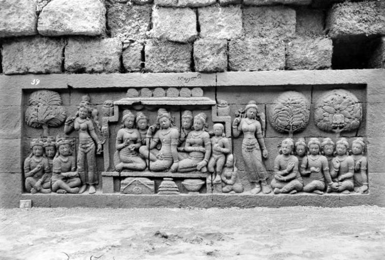 | Keywords: COLLECTIE TROPENMUSEUM Reliëf O 142 op de verborgen voet van de Borobudur TMnr 10015878.jpg nl Negatief Negatief waarop reliëf O 142 van de verborgen voet van de Borobudur te zien is De verborgen voet van de Borobudur is de oorspronkelijke basis van het Buddhistische heiligdom dat rond 800 gebouwd is In een latere fase van de bouw werd deze basis verborgen waarschijnlijk om verzakking te verkomen De verborgen voet loopt om het hele bouwwerk heen en bevat 160 reliëfs die tezamen de Mahakarmawibhangga verbeelden een Mahayanistische tekst die de werking van de leer van Karma uiteenzet Deze leerrede wordt aan Buddha toegeschreven en handelt over oorzaak en gevolg N J Krom en Th van Erp duiden in hun standaardwerk over de Borobudur Beschrijving van Barabudur Den Haag Martinus Nijhoff 1920-1931 de reliëfs van de verborgen voet aan als serie O Op de reliëfs zijn voorbeelden van de theorie uitgebeeld goede daden hebben goede gevolgen en slechte daden hebben slechte gevolgen De reliëfs vallen in twee delen uiteen O 1 tot en met O 117 verbeelden een aantal daden die leiden tot één en hetzelfde gevolg De reliëfs O 118 tot en met O 160 tonen verschillende gevolgen van één oorzaak De uiteenzetting van de leer begint bij de trap aan de oostzijde en ontrolt zich met de klok mee om het bouwwerk heen De reliëfs moeten dan ook gelezen worden van rechts naar links Lange tijd was onbekend wat op de reliëfs van de verborgen voet stond afgebeeld Hoewel de reliëfs al in 1885 waren ontdekt door Dr Ir J W IJzerman 1851-1932 kon de Franse geleerde Sylvain Lévi pas in 1929 op het zesde Congres van het Oostersch Genootschap constateren dat het op de verborgen voet ging om een Buddhistische tekst Mahakarmawibhangga Lévi had in 1922 een manuscript uit 1411 met deze tekst ontdekt in Kathmandu Nepal De tekst bleek populair in de Burdhistische wereld te zijn en een aantal verwante teksten te hebben twee Chinese werken waarvan één vertaald was in 582 door Gautama Dharmaprajna en één tussen 980 en 1000 door T'ien si Tsai Daarnaast bevat de Tibetaanse Kanjur twee werken met de titel Karmawibhangga In 1933 publiceerde de archeoloog N J Krom een uitgebreide analyse van het Mahakarmawibhangga op de reliëfs van de bedolven voet Hierin legt hij een relatie tussen de afbeeldingen op de reliëfs en de tekstpassages in het Mahakarmawibhangga Reliëf O 142 bevindt zich aan de oostzijde van de Borobudur en heeft volgens N J Krom betrekking op paragraaf 67 van het Mahakarmawibhangga in de Chinese versie Ch G LXVII Welke zijn de tien voordelen van de gift van een vaandel Antwoord men is een standaard in de wereld en wordt door de koning ministers verwanten vrienden enz vereerd; men is rijk onafhankelijk schatten bezittend; zijn roem wordt naar alle hemelstreken verbreid; men is levenslang schoon van uiterlijk; in volgende incarnaties is men vast en onveranderlijk van gedrag; men heeft grote waardigheid en deugd; men wordt herboren in voorname families; men wordt herboren in de hemels; men bereikt spoedig het Parinirwana Dit zijn de voordelen van de gift van een vaandel Deze paragraaf heeft betrekking op de reliëfs O 141 tot en met O 143 Boven O 141 staat de inscriptie 'pataka' vaandels en zijn voorwerpen afgebeeld die door een groep vereerders aan het heiligdom worden aangeboden Reliëf O 142 is geheel gewijd aan de aanzienlijke rijke man met gevolg en de inscriptie 'adhya-bhogi' zeer gefortuneerd Op O 143 zien we een soortgelijke persoon die een hemelgod voorstelt Er is geen inscriptie maar we zien een hemelboom juwelenpotten en kinnara's half mens half vogel De beeldhouwer heeft zich beperkt tot de steeds terugkerende rijke positie en de hergeboorte in de hemel Uit N J Krom Het Karmawibhangga op Barabudur Mededeelingen der koninklijke academie van wetenschappen afdeeling letterkunde deel 76 serie B No 8 Amsterdam Noordhollandsche Uitgevers-Maatschappij 1933 263-264 Bronnen A J Bernet Kempers Borobudur Mysteriegebeuren in steen Verval en restauratie Oudjavaans volksleven Wassenaar 1973/gewijzigde herdruk ; Van Erp Th Krom N J Beschrijving van Barabudur Den Haag Martinus Nijhoff 1920-1931 ; N J Krom Het Karmawibhangga op Barabudur Mededeelingen der koninklijke academie van wetenschappen afdeeling letterkunde deel 76 serie B No 8 Amsterdam Noordhollandsche Uitgevers-Maatschappij 1933 Reliëf O 142 op de verborgen voet van de Borobudur 1890-1891 institution Tropenmuseum KIT-source 10015878 Creator Kassian Cephas KIT-license PD-old-100 Photographs by Kassian Cephas Tropenmuseum Borobudur reliefs Borobudur in 1890 Black and white photographs |