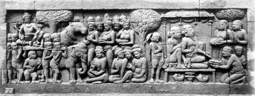 | Keywords: COLLECTIE TROPENMUSEUM Reliëf O 150 op de verborgen voet van de Borobudur TMnr 10015886.jpg nl Repronegatief Negatief waarop reliëf O 150 van de verborgen voet van de Borobudur te zien is De verborgen voet van de Borobudur is de oorspronkelijke basis van het Buddhistische heiligdom dat rond 800 gebouwd is In een latere fase van de bouw werd deze basis verborgen waarschijnlijk om verzakking te verkomen De verborgen voet loopt om het hele bouwwerk heen en bevat 160 reliëfs die tezamen de Mahakarmawibhangga verbeelden een Mahayanistische tekst die de werking van de leer van Karma uiteenzet Deze leerrede wordt aan Buddha toegeschreven en handelt over oorzaak en gevolg N J Krom en Th van Erp duiden in hun standaardwerk over de Borobudur Beschrijving van Barabudur Den Haag Martinus Nijhoff 1920-1931 de reliëfs van de verborgen voet aan als serie O Op de reliëfs zijn voorbeelden van de theorie uitgebeeld goede daden hebben goede gevolgen en slechte daden hebben slechte gevolgen De reliëfs vallen in twee delen uiteen O 1 tot en met O 117 verbeelden een aantal daden die leiden tot één en hetzelfde gevolg De reliëfs O 118 tot en met O 160 tonen verschillende gevolgen van één oorzaak De uiteenzetting van de leer begint bij de trap aan de oostzijde en ontrolt zich met de klok mee om het bouwwerk heen De reliëfs moeten dan ook gelezen worden van rechts naar links Lange tijd was onbekend wat op de reliëfs van de verborgen voet stond afgebeeld Hoewel de reliëfs al in 1885 waren ontdekt door Dr Ir J W IJzerman 1851-1932 kon de Franse geleerde Sylvain Lévi pas in 1929 op het zesde Congres van het Oostersch Genootschap constateren dat het op de verborgen voet ging om een Buddhistische tekst Mahakarmawibhangga Lévi had in 1922 een manuscript uit 1411 met deze tekst ontdekt in Kathmandu Nepal De tekst bleek populair in de Burdhistische wereld te zijn en een aantal verwante teksten te hebben twee Chinese werken waarvan één vertaald was in 582 door Gautama Dharmaprajna en één tussen 980 en 1000 door T'ien si Tsai Daarnaast bevat de Tibetaanse Kanjur twee werken met de titel Karmawibhangga In 1933 publiceerde de archeoloog N J Krom een uitgebreide analyse van het Mahakarmawibhangga op de reliëfs van de bedolven voet Hierin legt hij een relatie tussen de afbeeldingen op de reliëfs en de tekstpassages in het Mahakarmawibhangga Reliëf O 150 bevindt zich aan de oostzijde van de Borobudur en heeft volgens N J Krom betrekking op paragraaf 70 van het Mahakarmawibhangga LXX Welke zijn de tien goede eigenschappen van het geven van een vervoermiddel Antwoord men heeft kleine welgevormde voeten; men staat stevig op zijn voeten men wordt niet moe van de weg; men heeft niet veel vijanden; men verkrijgt herhaaldelijk magische kracht; men heeft geen gebrek aan vervoermiddelen olifanten paarden enz ; men heeft een rijke positie; men wordt herboren in de hemels; men bereikt spoedig het Parinirwana Zoals enz Dit zijn de tien goede eigenschappen van het geven van een vervoermiddel Deze paragraaf heeft betrekking op reliëfs O 150 en O 151 Op O 150a zien we zittende brahmanen in een paviljoen aan wie sandalen worden gegeven Erboven staat de inscriptie 'upanat' sandaal Op het volgende tafereel is de aankomst van een voornaam persoon in een draagstoel afgebeeld Daaraan vooraf gaan een paard en een olifant Volgens Krom gaat het hier om het voorstellen van het geen gebrek hebben aan vervoersmiddelen waarbij zowel de olifant als het paard uitdrukkelijk worden genoemd De inscriptie boven dit tafereel is niet duidelijk; volgens Krom staat er 'wahanawaikalya' of 'yanawaikalya' Op reliëf O 151 zien we wezens onder een boom maar het is onduidelijk of ze kinnara's half mens half vogel zijn De opzet van het tafereel geeft voldoende aan dat het gaat om een god met zijn gevolg De inscriptie 'swargga' hemel bevestigt dat Krom meent dat het waarschijnlijk is dat alles bij elkaar hoort en reliëf O 151 in zijn geheel een hemel weergeeft Uit N J Krom Het Karmawibhangga op Barabudur Mededeelingen der koninklijke academie van wetenschappen afdeeling letterkunde deel 76 serie B No 8 Amsterdam Noordhollandsche Uitgevers-Maatschappij 1933 267 Bronnen A J Bernet Kempers Borobudur Mysteriegebeuren in steen Verval en restauratie Oudjavaans volksleven Wassenaar 1973/gewijzigde herdruk ; Van Erp Th Krom N J Beschrijving van Barabudur Den Haag Martinus Nijhoff 1920-1931 ; N J Krom Het Karmawibhangga op Barabudur Mededeelingen der koninklijke academie van wetenschappen afdeeling letterkunde deel 76 serie B No 8 Amsterdam Noordhollandsche Uitgevers-Maatschappij 1933 Reliëf O 150 op de verborgen voet van de Borobudur 1890-1891 institution Tropenmuseum KIT-source 10015886 Creator Kassian Cephas Borobudur in 1890 Black and white photographs |