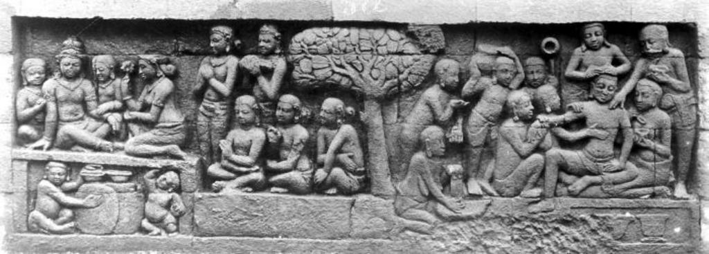 | Keywords: COLLECTIE TROPENMUSEUM Reliëf O 19 op de verborgen voet van de Borobudur TMnr 10015757.jpg nl Repronegatief Negatief waarop reliëf O 19 van de verborgen voet van de Borobudur te zien is De verborgen voet van de Borobudur is de oorspronkelijke basis van het Buddhistische heiligdom dat rond 800 gebouwd is In een latere fase van de bouw werd deze basis verborgen waarschijnlijk om verzakking te verkomen De verborgen voet loopt om het hele bouwwerk heen en bevat 160 reliëfs die tezamen de Mahakarmawibhangga verbeelden een Mahayanistische tekst die de werking van de leer van Karma uiteenzet Deze leerrede wordt aan Buddha toegeschreven en handelt over oorzaak en gevolg N J Krom en Th van Erp duiden in hun standaardwerk over de Borobudur Beschrijving van Barabudur Den Haag Martinus Nijhoff 1920-1931 de reliëfs van de verborgen voet aan als serie O Op de reliëfs zijn voorbeelden van de theorie uitgebeeld goede daden hebben goede gevolgen en slechte daden hebben slechte gevolgen De reliëfs vallen in twee delen uiteen O 1 tot en met O 117 verbeelden een aantal daden die leiden tot één en hetzelfde gevolg De reliëfs O 118 tot en met O 160 tonen verschillende gevolgen van één oorzaak De uiteenzetting van de leer begint bij de trap aan de oostzijde en ontrolt zich met de klok mee om het bouwwerk heen De reliëfs moeten dan ook gelezen worden van rechts naar links Lange tijd was onbekend wat op de reliëfs van de verborgen voet stond afgebeeld Hoewel de reliëfs al in 1885 waren ontdekt door Dr Ir J W IJzerman 1851-1932 kon de Franse geleerde Sylvain Lévi pas in 1929 op het zesde Congres van het Oostersch Genootschap constateren dat het op de verborgen voet ging om een Buddhistische tekst Mahakarmawibhangga Lévi had in 1922 een manuscript uit 1411 met deze tekst ontdekt in Kathmandu Nepal De tekst bleek populair in de Burdhistische wereld te zijn en een aantal verwante teksten te hebben twee Chinese werken waarvan één vertaald was in 582 door Gautama Dharmaprajna en één tussen 980 en 1000 door T'ien si Tsai Daarnaast bevat de Tibetaanse Kanjur twee werken met de titel Karmawibhangga In 1933 publiceerde de archeoloog N J Krom een uitgebreide analyse van het Mahakarmawibhangga op de reliëfs van de bedolven voet Hierin legt hij een relatie tussen de afbeeldingen op de reliëfs en de tekstpassages in het Mahakarmawibhangga Reliëf O 19 bevindt zich aan de oostzijde van de Borobudur en correspondeert volgens N J Krom met de vierde paragraaf van het Mahakarmawibhangga Wat is de daad die weinig pijnen ten gevolge heeft Antwoord het afzien van het geven van stompen en slagen; het aanzetten daartoe; het prijzen daarvan; het zich daar hogelijk op verheugen; zijn uitgeputte vader en moeder van dienst zijn en ook anderen huisvaders en zwervende geestelijken; niet tevreden zijn over de ziekte van een vijand; tevreden zijn met diens herstel; het geven van geneesmiddelen en goed verteerbaar voedsel Dat is de daad die weinig pijnen ten gevolge heeft Uit N J Krom Het Karmawibhangga op Barabudur Mededeelingen der koninklijke academie van wetenschappen afdeeling letterkunde deel 76 serie B No 8 Amsterdam Noordhollandsche Uitgevers-Maatschappij 1933 222 De beeldhouwer toont de toestand van weinig pijnen op reliëfs O 16 tot en met O 19 door middel van de afbeelding van een aanzienlijke man met zijn gezin en dienaren Op 19a krijgt een zieke persoon geneesmiddelen en voedsel Uit zijn houding blijkt volgens Krom dat die hem goed doen Bronnen A J Bernet Kempers Borobudur Mysteriegebeuren in steen Verval en restauratie Oudjavaans volksleven Wassenaar 1973/gewijzigde herdruk ; Van Erp Th Krom N J Beschrijving van Barabudur Den Haag Martinus Nijhoff 1920-1931 ; N J Krom Het Karmawibhangga op Barabudur Mededeelingen der koninklijke academie van wetenschappen afdeeling letterkunde deel 76 serie B No 8 Amsterdam Noordhollandsche Uitgevers-Maatschappij 1933 Reliëf O 19 op de verborgen voet van de Borobudur 1890-1891 institution Tropenmuseum KIT-source 10015757 Creator Kassian Cephas KIT-license PD-old-100 Photographs by Kassian Cephas Tropenmuseum Borobudur reliefs Borobudur in 1890 Black and white photographs |