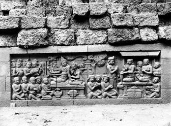 | Keywords: COLLECTIE TROPENMUSEUM Reliëf O 27 op de verborgen voet van de Borobudur TMnr 10015765.jpg nl Negatief Negatief waarop reliëf O 27 van de verborgen voet van de Borobudur te zien is De verborgen voet van de Borobudur is de oorspronkelijke basis van het Buddhistische heiligdom dat rond 800 gebouwd is In een latere fase van de bouw werd deze basis verborgen waarschijnlijk om verzakking te verkomen De verborgen voet loopt om het hele bouwwerk heen en bevat 160 reliëfs die tezamen de Mahakarmawibhangga verbeelden een Mahayanistische tekst die de werking van de leer van Karma uiteenzet Deze leerrede wordt aan Buddha toegeschreven en handelt over oorzaak en gevolg N J Krom en Th van Erp duiden in hun standaardwerk over de Borobudur Beschrijving van Barabudur Den Haag Martinus Nijhoff 1920-1931 de reliëfs van de verborgen voet aan als serie O Op de reliëfs zijn voorbeelden van de theorie uitgebeeld goede daden hebben goede gevolgen en slechte daden hebben slechte gevolgen De reliëfs vallen in twee delen uiteen O 1 tot en met O 117 verbeelden een aantal daden die leiden tot één en hetzelfde gevolg De reliëfs O 118 tot en met O 160 tonen verschillende gevolgen van één oorzaak De uiteenzetting van de leer begint bij de trap aan de oostzijde en ontrolt zich met de klok mee om het bouwwerk heen De reliëfs moeten dan ook gelezen worden van rechts naar links Lange tijd was onbekend wat op de reliëfs van de verborgen voet stond afgebeeld Hoewel de reliëfs al in 1885 waren ontdekt door Dr Ir J W IJzerman 1851-1932 kon de Franse geleerde Sylvain Lévi pas in 1929 op het zesde Congres van het Oostersch Genootschap constateren dat het op de verborgen voet ging om een Buddhistische tekst Mahakarmawibhangga Lévi had in 1922 een manuscript uit 1411 met deze tekst ontdekt in Kathmandu Nepal De tekst bleek populair in de Burdhistische wereld te zijn en een aantal verwante teksten te hebben twee Chinese werken waarvan één vertaald was in 582 door Gautama Dharmaprajna en één tussen 980 en 1000 door T'ien si Tsai Daarnaast bevat de Tibetaanse Kanjur twee werken met de titel Karmawibhangga In 1933 publiceerde de archeoloog N J Krom een uitgebreide analyse van het Mahakarmawibhangga op de reliëfs van de bedolven voet Hierin legt hij een relatie tussen de afbeeldingen op de reliëfs en de tekstpassages in het Mahakarmawibhangga Reliëf O 27 bevindt zich aan de zuidzijde van de Borobudur en correspondeert volgens N J Krom met de zesde paragraaf van het Mahakarmawibhangga Wat is de daad die bevalligheid ten gevolge heeft Antwoord afwezigheid van toorn; afwezigheid van haatdragendheid; afwezigheid van geveinsdheid; het schenken van kleden; het geven van stuco voor stupa's en caitya-monumenten; het geven van gouden vaatwerk het geven van welriekende pleister; het geven van versierselen; het prijzen van vader en moeder; het prijzen van edele deugdzame lieden; het schoonvegen van stupahoven en kloosters; het voortdurend schoonvegen van caitya- monumenten; het niet uitlachen van wanstaltige wezens en ook van anderen kinderen en grijsaards; desgelijks een behoorlijk gedrag Zoals Dat is de daad die bevalligheid ten gevolge heeft Uit N J Krom Het Karmawibhangga op Barabudur Mededeelingen der koninklijke academie van wetenschappen afdeeling letterkunde deel 76 serie B No 8 Amsterdam Noordhollandsche Uitgevers-Maatschappij 1933 223 Deze paragraaf heeft betrekking op reliëfs O 26 tot en met O 33 Op de linkertaferelen is gratie bevalligheid uitgebeeld door middel van een aanzienlijke man met zijn gezin en personeel; het gevolg van hetgeen op het rechtergedeelte is te zien Op 27a wordt een brahmanenfamilie eerbiedig benaderd waarbij ook geschenken worden gegeven Bronnen A J Bernet Kempers Borobudur Mysteriegebeuren in steen Verval en restauratie Oudjavaans volksleven Wassenaar 1973/gewijzigde herdruk ; Van Erp Th Krom N J Beschrijving van Barabudur Den Haag Martinus Nijhoff 1920-1931 ; N J Krom Het Karmawibhangga op Barabudur Mededeelingen der koninklijke academie van wetenschappen afdeeling letterkunde deel 76 serie B No 8 Amsterdam Noordhollandsche Uitgevers-Maatschappij 1933 Reliëf O 27 op de verborgen voet van de Borobudur 1890-1891 institution Tropenmuseum KIT-source 10015765 Creator Kassian Cephas KIT-license PD-old-100 Photographs by Kassian Cephas Tropenmuseum Borobudur reliefs Borobudur in 1890 Black and white photographs |