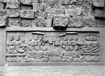 | Keywords: COLLECTIE TROPENMUSEUM Reliëf O 106 op de verborgen voet van de Borobudur TMnr 10015843.jpg nl Negatief Negatief waarop reliëf O 106 van de verborgen voet van de Borobudur te zien is De verborgen voet van de Borobudur is de oorspronkelijke basis van het Buddhistische heiligdom dat rond 800 gebouwd is In een latere fase van de bouw werd deze basis verborgen waarschijnlijk om verzakking te verkomen De verborgen voet loopt om het hele bouwwerk heen en bevat 160 reliëfs die tezamen de Mahakarmawibhangga verbeelden een Mahayanistische tekst die de werking van de leer van Karma uiteenzet Deze leerrede wordt aan Buddha toegeschreven en handelt over oorzaak en gevolg N J Krom en Th van Erp duiden in hun standaardwerk over de Borobudur Beschrijving van Barabudur Den Haag Martinus Nijhoff 1920-1931 de reliëfs van de verborgen voet aan als serie O Op de reliëfs zijn voorbeelden van de theorie uitgebeeld goede daden hebben goede gevolgen en slechte daden hebben slechte gevolgen De reliëfs vallen in twee delen uiteen O 1 tot en met O 117 verbeelden een aantal daden die leiden tot één en hetzelfde gevolg De reliëfs O 118 tot en met O 160 tonen verschillende gevolgen van één oorzaak De uiteenzetting van de leer begint bij de trap aan de oostzijde en ontrolt zich met de klok mee om het bouwwerk heen De reliëfs moeten dan ook gelezen worden van rechts naar links Lange tijd was onbekend wat op de reliëfs van de verborgen voet stond afgebeeld Hoewel de reliëfs al in 1885 waren ontdekt door Dr Ir J W IJzerman 1851-1932 kon de Franse geleerde Sylvain Lévi pas in 1929 op het zesde Congres van het Oostersch Genootschap constateren dat het op de verborgen voet ging om een Buddhistische tekst Mahakarmawibhangga Lévi had in 1922 een manuscript uit 1411 met deze tekst ontdekt in Kathmandu Nepal De tekst bleek populair in de Burdhistische wereld te zijn en een aantal verwante teksten te hebben twee Chinese werken waarvan één vertaald was in 582 door Gautama Dharmaprajna en één tussen 980 en 1000 door T'ien si Tsai Daarnaast bevat de Tibetaanse Kanjur twee werken met de titel Karmawibhangga In 1933 publiceerde de archeoloog N J Krom een uitgebreide analyse van het Mahakarmawibhangga op de reliëfs van de bedolven voet Hierin legt hij een relatie tussen de afbeeldingen op de reliëfs en de tekstpassages in het Mahakarmawibhangga De reliëfs O 101 tot en met O 108 bevinden zich aan de noordzijde van de Borobudur en hebben volgens N J Krom betrekking op de paragrafen twintig tot en met tweeëntwintig van het Mahakarmawibhangga XX Wat is de daad die een geboorte onder de goden van de sfeer der Begeerte ten gevolge heeft Antwoord de tien goede wegen van de daad goed ten einde gebracht Dat is de daad die een geboorte onder de goden van de sfeer der Begeerte ten gevolge heeft XXI Wat is de daad die een geboorte onder de goden van de sfeer van de Vorm ten gevolge heeft Antwoord de tien goede wegen van de daad goed ten einde gebracht goed eigen gemaakt en op de meest voortreffelijke wijze vervolmaakt Dat is de daad die een geboorte onder de goden van de sfeer van de Vorm ten gevolge heeft XXII Wat is de daad die een geboorte onder de goden van de Vormloze sfeer ten gevolge heeft Antwoord de vier instellingen der meditatie van het vormloze de categorie van de oneindigheid van de ruimte de categorie van de oneindigheid van de kennis de categorie van de oneindigheid van het niet de categorie van inzicht en niet-niet-inzicht; deze instellingen van meditatie worden toegepast en vermenigvuldigd Dat is de daad die een geboorte onder de goden van de Vormloze sfeer ten gevolge heeft Op O 101 en O 102 treffen wij hemelvoorstellingen aan Hemelvoorstellingen worden gekarakteriseerd door wensbomen potten vol kostbaarheden onderaan de stam en door twee kinnara's wezens die half mens half vogel zijn Ook op andere plaatsen op het monument worden deze symbolen gebruikt om de hemel voor te stellen Hemeltaferelen worden soms door de inscriptie 'swargga' aangeduid De staande figuren van O 101b en de zittende met aureool op O 102b bevinden zich in een hemel De oorzaak daarvan vinden we op O 101a de aanbieding van een gift aan een brahmaan Op O 102a zien we een predikende monnik en een uitdeling aan behoeftigen Op de linkertaferelen ontbreken de kinnara's en de hemelbomen maar het lijkt Krom niet onwaarschijnlijk dat hier ook een hemel bedoeld is we zien op O 103c naast een paleis of een tempel een persoon in groot ornaat tussen vrouwen die hem dienen De groep op O 104c is voorzien van aureolen O 104 a en op O 104b tonen een predikende monnik en een uitdeling Op 104a is een gift van geschenken afgebeeld aan brahmanen Op 104b zit een mediterende persoon tussen twee onafgewerkte bomen Volgens Krom is het aannemelijk dat de beeldhouwer de hemelboom met kinnara's gereserveerd heeft voor de Kamawacara-goden Hieruit volgt dat O 101 en O 102 bij paragraaf XX horen en de hemels van O 103 en O 104 bij de goden van Rupawacara van XXI De grote moeilijkheid komt dan bij de goden van Arupyawacara van XXII want het lijkt Krom uitgesloten dat deze wezens weergegeven kunnen worden in een vorm; men mag ze zelfs helemaal niet verwachten op reliëfs Maar Krom meent dat op O 105 een poging is gedaan om aan te geven om de staat van vormeloosheid te bereiken; de vier monniken die ieder in een afzonderlijke rotsnis zitten te mediteren zouden de vier samapatti's van de tekst vertegenwoordigen Op reliëf O 106 is de hoofdpersoon in groot ornaat afgebeeld met een aureool achter het hoofd Achter zijn dienaren staat op het midden van het reliëf een boom; niet de gestileerde hemelboom maar wel met de juwelenpotten aan de voet O 106a geeft een huldebetuiging weer onder andere met een tros bananen van een aantal monniken De hoofdpersoon van O 107b heeft geen aureool maar draagt wel groot ornaat Ook hier staan juwelenpotten O 107a toont een uitdeling van onder meer kleding Reliëf O 108 begint met het geven van geschenken door rijk geklede perso