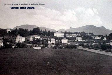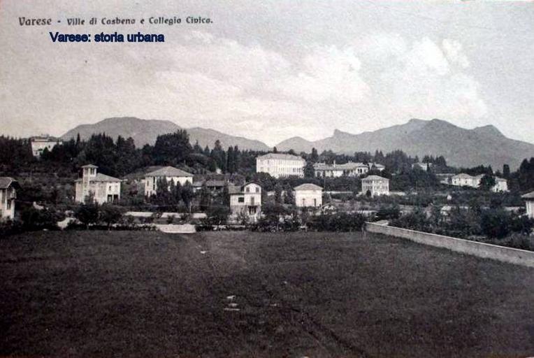 | Keywords: L'immagine è ripresa dall'attuale via Monte Rosa, tutto la spazio erboso è ora occupato da edifici scolastici. A destra il basso profilo di villa Quiete preceduto dall'edificio porticato del Collegio Civico patrocinato dai fratelli Macchi (ora occupato dalla scuola media Dante). Villa Quiete era appartenuta ai Sanvito, ottenuta dalla trasformazione del precedente convento dei frati cappuccini (trasferitì lì dal vicino monastero vecchio nel 1689) e ora sede del liceo classico. Del vasto parco della villa si nota la macchia di cipressi (in origine cinque) a circolo dove sarebbero state sepolti i visceri del signore di Varese, il duca Francesco III d'Este, dopo il parziale abbattimento della chiesa dei cappuccini (San Bartolomeo) dove era inumata la salma (in seguito trasferita al nuovo cimitero di Giubiano). In alto a sinistra villa Leonino (già Barbò) che a partire dal 1919 è stata ampliamente trasformata e adibita a clinica privata con il nome di "La Quiete" preso dalla sottostante villa dei Sanvito. varese casbeno |