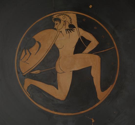| Keywords: Colmar Painter - Running Warrior - Walters 481920 - Detail.jpg  The tondo of the kylix shows a youthful warrior with long curly hair He is nude except for his Attic helmet and holds a spear and a large round shield decorated with a horse of which only the back is visible He seems to be running from an enemy on the left his head shield and spear are turned backwards left while he is fleeing in the opposite direction The artist skillfully explores the various angles of the twisted body and fits it nicely into the circular shape of the tondo The inscription in red translates to the boy is beautiful ca 510 BC Archaic terracotta With handles H 5 x W 15 11/16 x Diam 12 5/16 in 12 7 x 39 8 x 31 3 cm ; H at rim cm 12 accession number 48 1920 3127 Somzée Collection Brussels date and mode of acquisition unknown Sale May 20-25 1901 no 36 Sale Hôtel Drouot 1910 no 146 Jerome Stonborough before 1940 mode of acquisition unknown Sale Parke-Bernet Galleries October 18 1940 no 82 Charles L Morley New York date and mode of acquisition unknown Walters Art Museum 1945 by purchase Museum purchase 1945 inscription In Search of Ancient Treasure 40 Years of Collecting The Walters Art Gallery Baltimore 1978 Heroes Mortals and Myths in Ancient Greece The Walters Art Museum Baltimore; Frist Center for the Visual Arts Nashville; San Diego Museum Of Art San Diego; Alexander S Onassis Public Benefit Foundation USA New York 2009-2011 place of origin Attica Greece <gallery>File Colmar Painter - Running Warrior - Walters 481920 - Detail 1 jpg Retouched version</gallery> Walters Art Museum license 2D Ancient Greek red-figure pottery in the Walters Art Museum Colmar Painter Running in art People with shields in art Round shields Nude males in ancient Greek pottery Media contributed by the Walters Art Museum needs artist update Warriors in ancient Greek pottery |