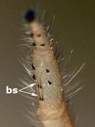 | Keywords: Colonus puerperus female tibia.jpg en Ventral surface of tibia of first leg of a female Colonus puerperus jumping spider The two pairs of bulbous spines or setae near the bottom of the photograph are characteristic of the genus Colonus and closely related genera Own Kaldari 2009-05-28 Colonus genus Photos of spiders by Ryan Kaldari Araneae legs |
