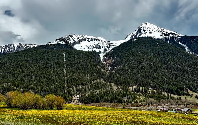 Keywords: colorado landscape scenic mountains snow valley meadow pastoral dandelions houses homes sky clouds nature outdoors country rural hdr