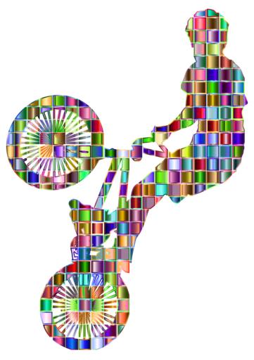Keywords: colorful prismatic chromatic rainbow squares mosaic checkered abstract geometric art bmx bicycle bike ride vehicle transportation sport athlete stunt trick man male boy