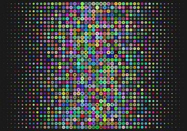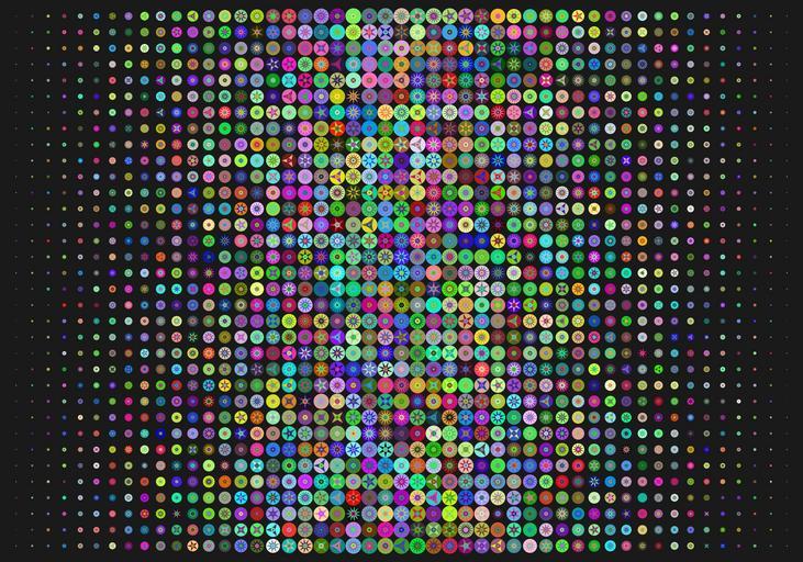| Keywords: geometry circles color colour colors colours julia code indoor texture pattern While testing a few lines of code that produce spiky wheel shapes, I started chasing the limits of how many could be produced. I wonder if any are duplicates? Each one can encode six colours and 3 different selections of between 3 and 16 spokes, so there are about two billion different possibilities.  While testing a few lines of code that produce spiky wheel shapes, I started chasing the limits of how many could be produced. I wonder if any are duplicates? Each one can encode six colours and 3 different selections of between 3 and 16 spokes, so there are about two billion different possibilities.   |