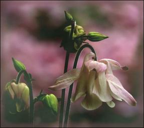 Keywords: columbine blossom bloom flower hahnenfußgewächs flora pink light pink rose filigree petals macro garden plant flowers spring tender bloom greenish close green nature hanging