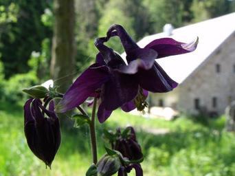 Keywords: columbine flower nature dark purple flora violet blossom bloom stone house garden