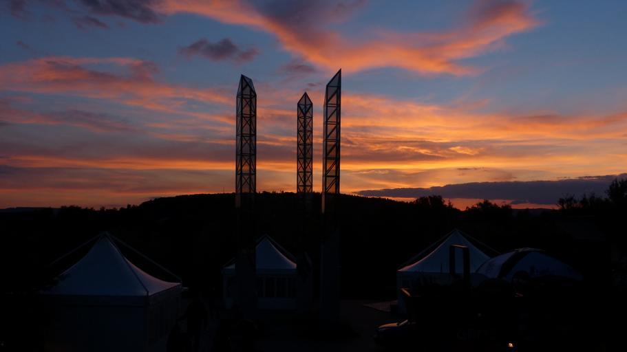Keywords: columnar steles glass columns art artwork modern art sunset afterglow sky clouds uni irchel zurich switzerland university of irchel