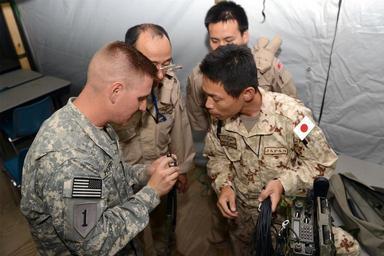 Keywords: Combined Joint Task Force-Horn of Africa 130705-N-IZ662-450.jpg en From left U S Army 1st Lt Christopher Hoff Japan Maritime Self-Defense Force Lt Hirosuke Watanbe Leading Seaman Daisuke Araki and Japan Ground Self-Defense Force Sgt 1st Class Yasuyuki Iwashita inspect radio equipment July 5 2013 at Camp Lemonnier Djibouti Hoff was a communications officer with the 1st Battalion 63rd Armor Regiment 2nd Armor Brigade Combat Team 1st Infantry Division The Japanese service members were assigned to the Japan Self-Defense Force Deployment Air Force for Counterpiracy Enforcement unit a Combined Joint Task Force-Horn of Africa coalition partner U S Navy photo by Mass Communication Specialist 1st Class Tom Ouellette/Released 2013-07-05 Petty Officer 1st Class Thomas Ouellette https //www dvidshub net/image/974969 130705-N-IZ662-450 2013-07-18 23 47 CAMP LEMONNIER DJ PD-USGov-Military-Navy Combined Joint Task Force - Horn of Africa Camp Lemonnier Images from DoD uploaded by Fæ People of the JMSDF People of the JGSDF |