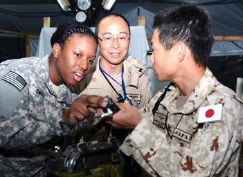 Keywords: Combined Joint Task Force-Horn of Africa 130705-N-IZ662-491.jpg en From left U S Army Pfc Kherrion Sweet Japan Maritime Self-Defense Force Lt Hirosuke Watanbe and Japan Ground Self-Defense Force Sgt 1st Class Yasuyuki Iwashita inspect radio equipment July 5 2013 at Camp Lemonnier Djibouti During their deployments U S and Japanese service members developed an emergency communications system and tested their radio equipment to ensure the gear was compatible Sweet was a signals systems operator with the 1st Battalion 63rd Armor Regiment 2nd Armor Brigade Combat Team 1st Infantry Division Watanbe and Iwashita were assigned to the Japan Self-Defense Force Deployment Air Force for Counterpiracy Enforcement unit a Combined Joint Task Force-Horn of Africa coalition partner U S Navy photo by Mass Communication Specialist 1st Class Tom Ouellette/Released 2013-07-05 Petty Officer 1st Class Thomas Ouellette https //www dvidshub net/image/974970 130705-N-IZ662-491 2013-07-18 23 47 CAMP LEMONNIER DJ PD-USGov-Military-Navy Combined Joint Task Force - Horn of Africa Camp Lemonnier Images from DoD uploaded by Fæ People of the JMSDF People of the JGSDF |