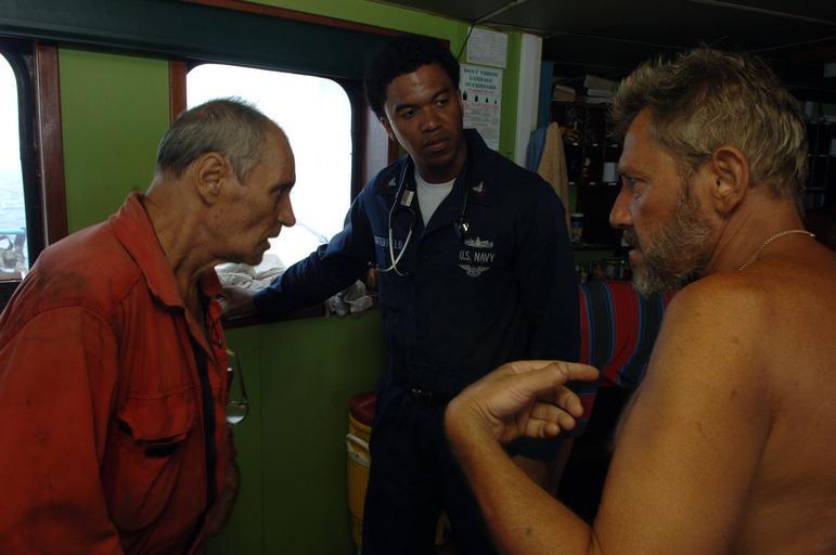 | Keywords: Combined Task Force 151 - 090207-N-3931M-230.jpg  en 090207-N-3931M-230 OFF THE COAST OF SOMALIA Feb 7 2009 “ Hospital Corpsman 2nd Class Patrick Satterfield from the guided missile destroyer USS Mason DDG-87 listens to a crew member aboard Motor Vessel Faina discuss a medical condition Somali pirates released Faina Feb 5 after holding the ship hostage for more than four months at an anchorage off the Somali coast The Belize-flagged cargo ship is owned and operated by Kaalbye Shipping Ukraine and is carrying a cargo of Ukrainian T-72 tanks and related equipment U S Navy photo by Mass Communication Specialist 1st Class Michael R McCormick/Released http //www news navy mil/view_single asp id 68695 Mass Communication Specialist 1st Class Michael R McCormick USN 2009-02-07 PD-USGov-Military-Navy Combined Task Force 151 Faina ship 1978  |