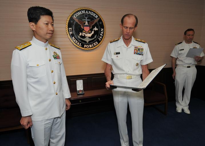 | Keywords: Commander, US Naval Forces Japan Rear Adm. Dan Cloyd awards the Legion of Merit to Vice Adm. Tomohisa Takei of the Japan Maritime Self Defense Force 110517-N-AG621-029.jpg en Commander U S Naval Forces Japan Rear Adm Dan Cloyd displays the Legion of Merit award citation to Vice Adm Tomohisa Takei of the Japan Maritime Self Defense Force during an award ceremony at CNFJ headquarters Cloyd presented Takei the Legion of Merit on behalf of U S Secretary of Defense Robert Gates The award was presented as recognition for Takei's exceptional leadership and expertise in maturing and expanding the JMSDF and U S Navy partnership during his role as director of operations and plans department JMSDF Maritime Staff Office from April 2008 to July 2010 2011-05-17 Petty Officer 1st Class Brock Taylor https //www dvidshub net/image/402636 110517-N-AG621-029 2011-05-17 03 26 YOKOSUKA KANAGAWA JP PD-USGov-Military-Navy Dan Cloyd Images from DoD uploaded by Fæ Tomohisa Takei |