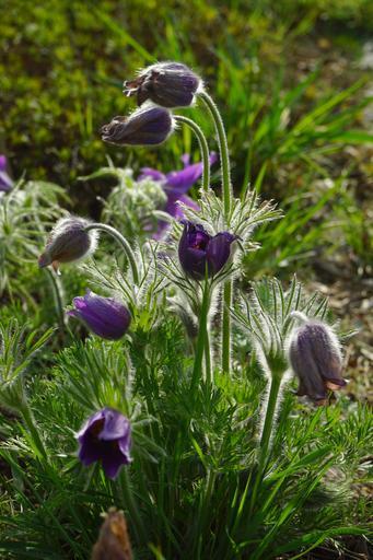 Keywords: common pasque flower flowers violet stalk leaves pulsatilla vulgaris hahnenfußgewächs ranunculaceae hair hairy back light bright crimson