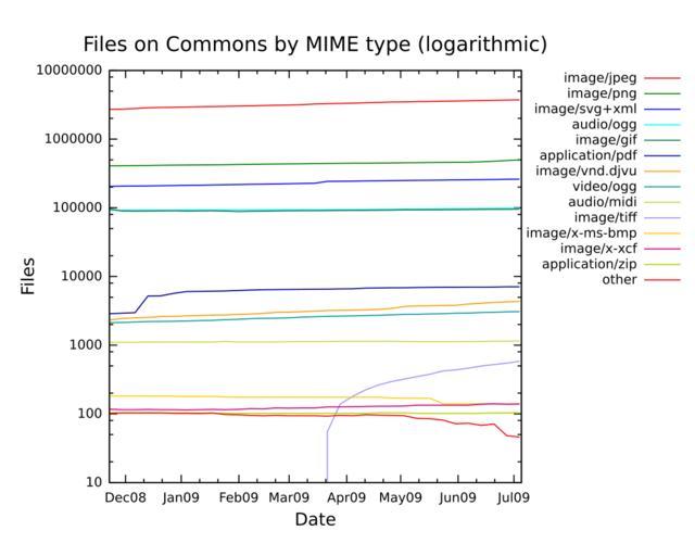| Keywords: Commons MIME statistics files 2008-11-23 to 2009-07-06.svg en A logarithmic plot of the number of files on Commons by MIME type from formatdate 2008-11-23 to formatdate 2009-07-06 as gathered by MIMEStatBot own ; plotted with gnuplot based on raw data at http //toolserver org/~vyznev/stats/commons_mime_statistics_data txt Ilmari Karonen 2009-07-06 <gallery> File Commons MIME statistics bytes 2008-11-23 to 2009-07-06 svg By total size in bytes </gallery> Other fields G + Notes Ogg audio and video files are listed as audio/ogg and video/ogg respectively even though the database currently lists both as application/ogg The image/x-xcf counts include files listed as unknown/unknown since they seem to be almost exclusively XCF files The application/zip files are almost exclusively OpenOffice documents Files of type image/x-ms-bmp have been listed separately despite not being an officially allowed file format on Commons since a considerable number of them still remain cc-zero Data in tabular format wikitable Date image/jpeg image/png image/svg+xml audio/ogg image/gif application/pdf image/vnd djvu video/ogg audio/midi image/tiff image/x-ms-bmp image/x-xcf application/zip Other - align right left formatdate 2008-11-23 2 709 604 408 281 205 041 92 154 96 267 2 872 2 328 2 124 1 097 0 182 117 103 102 - align right left formatdate 2008-11-30 2 736 523 409 799 206 341 92 247 89 830 2 922 2 444 2 138 1 101 0 182 115 103 103 - align right left formatdate 2008-12-07 2 789 692 411 383 207 443 92 421 89 247 2 982 2 505 2 174 1 103 0 182 115 103 103 - align right left formatdate 2008-12-14 2 862 198 413 373 208 535 92 557 89 559 5 180 2 539 2 205 1 109 0 182 116 103 103 - align right left formatdate 2008-12-21 2 881 496 415 464 209 640 92 651 90 200 5 222 2 606 2 218 1 109 0 181 115 103 103 - align right left formatdate 2008-12-28 2 900 181 417 469 210 435 92 675 90 360 5 673 2 626 2 226 1 108 0 181 115 103 102 - align right left formatdate 2009-01-04 2 928 187 419 190 211 995 92 719 89 729 6 034 2 675 2 248 1 109 0 180 114 103 102 - align right left formatdate 2009-01-11 2 952 532 421 062 213 268 92 838 89 981 6 069 2 708 2 279 1 112 0 180 115 103 101 - align right left formatdate 2009-01-18 2 975 414 422 391 214 549 92 913 90 319 6 102 2 731 2 296 1 112 0 179 116 102 103 - align right left formatdate 2009-01-25 2 997 929 424 192 216 607 92 988 89 654 6 148 2 752 2 348 1 134 0 177 115 102 98 - align right left formatdate 2009-02-01 3 023 924 427 055 218 408 93 091 88 385 6 252 2 801 2 379 1 113 0 175 116 102 97 - align right left formatdate 2009-02-08 3 050 139 428 891 219 531 93 200 88 849 6 342 2 841 2 432 1 115 0 175 119 102 95 - align right left formatdate 2009-02-15 3 079 328 431 526 220 838 93 230 89 408 6 413 2 908 2 457 1 117 0 175 118 102 94 - align right left formatdate 2009-02-22 3 108 537 433 710 222 130 93 497 89 921 6 441 2 995 2 474 1 120 0 175 122 102 95 - align right left formatdate 2009-03-01 3 134 020 436 209 224 569 93 818 90 385 6 471 3 026 2 500 1 124 0 175 121 102 94 - align right left formatdate 2009-03-08 3 171 980 438 137 225 868 93 970 90 687 6 498 3 068 2 557 1 127 0 175 122 102 94 - align right left formatdate 2009-03-15 3 243 280 439 944 227 909 94 032 90 679 6 515 3 126 2 596 1 126 0 174 122 102 94 - align right left formatdate 2009-03-22 3 275 339 441 702 242 082 94 126 91 055 6 555 3 191 2 633 1 134 55 174 126 102 93 - align right left formatdate 2009-03-29 3 301 394 443 599 243 489 94 280 91 419 6 604 3 215 2 648 1 135 139 174 126 102 95 - align right left formatdate 2009-04-05 3 333 688 445 199 244 706 94 417 91 717 6 633 3 247 2 675 1 136 181 174 127 102 94 - align right left formatdate 2009-04-12 3 385 695 446 608 245 850 94 541 91 976 6 773 3 272 2 698 1 136 224 174 128 102 97 - align right left formatdate 2009-04-19 3 429 031 448 123 246 884 95 050 92 250 6 811 3 326 2 718 1 138 264 174 129 103 96 - align right left formatdate 2009-04-26 3 457 731 449 949 248 266 95 071 92 706 6 861 3 424 2 768 1 141 296 170 129 103 95 - align right left formatdate 2009-05-03 3 484 642 452 189 249 612 96 029 93 082 6 873 3 665 2 811 1 132 320 169 130 103 94 - align right left formatdate 2009-05-10 3 511 879 454 200 251 091 96 247 93 363 6 913 3 723 2 821 1 122 349 169 134 102 86 - align right left formatdate 2009-05-17 3 536 520 455 914 251 984 96 446 93 541 6 947 3 749 2 855 1 123 377 169 134 102 85 - align right left formatdate 2009-05-24 3 565 698 457 605 253 219 96 908 93 749 6 966 3 773 2 875 1 123 421 141 134 102 81 - align right left formatdate 2009-05-31 3 590 854 459 731 254 574 97 181 94 111 6 982 3 809 2 917 1 125 437 141 134 102 72 - align right left formatdate 2009-06-07 3 614 875 461 982 255 647 97 307 94 356 7 004 3 973 2 935 1 128 463 140 134 102 73 - align right left formatdate 2009-06-14 3 644 797 466 827 256 978 97 584 94 690 7 009 4 074 2 984 1 132 497 140 138 102 68 - align right left formatdate 2009-06-21 3 669 390 477 192 258 158 97 995 95 025 7 033 4 194 3 009 1 144 523 140 140 103 71 - align right left formatdate 2009-06-28 3 695 643 486 689 259 510 98 269 95 178 7 072 4 276 3 063 1 147 548 139 138 103 48 - align right left pages with source data |