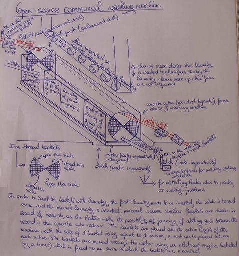 | Keywords: Communal washing machine.JPG Natural_cleaning_product Note that instead of the large lids shown above hinge doors placed over a hole may also be used 1 hole per section ; these reduce wear on the joints as the areas connecting are less large Also 2 heating coils with a temperature sensor can be added if the water temperature is found to cool down too rapidly The coils can be inserted from the top to a area out of reach of the baskets Laundry seperation can be done inmediately when the clothes are discarded rather than needing to seperate it twice Own KVDP Washing laundry Laundry equipment Appropriate technology |