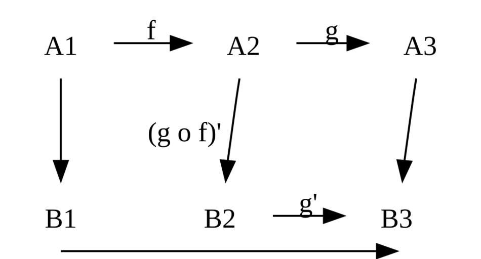 | Keywords: Commutative diagram bad.svg Bad commutative diagram made with DOT Own 2007-10-24 Tlep This image was made with DOT language and shows limitations of it Right rectangle isn't square and label g o f is in wrong place See fixed version of this image <code><pre> digraph g node shape plaintext A1 -> B1 A2 -> B2 A3 -> B3 A1 -> A2 label f A2 -> A3 label g B2 -> B3 label g' B1 -> B3 label g o f ' tailport s headport s rank same; A1 A2 A3 rank same; B1 B2 B3 </pre></code> Created with Graphviz Images with Graphviz source code |