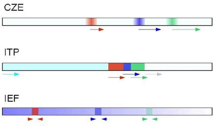 Keywords: Comparison CZE ITP IEF.jpg en Comparison of some electrophoretic techniques namely zone electrophoresis isotachophoresis and iso-electric focusing Green blue red analytes rrows give an indication of the relative speed and direction of electrophoresis In zone electrophoresis the analytes are separated according to their electrophoretic mobilities In isotachophoresis the analytes are separated according to their electrophoretic mobilities but remain sandwiched between the terminating and leading electrophoresis In iso-electric focussing a pH-gradient is created and the analytes are focussed at the location where the pH matches their pI Own Josq 2008-11-22 Comparison_CZE_ITP_IEF svg Electrophoresis |