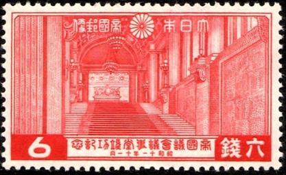 | Keywords: Completion of Diet Building stamp of 6sen.jpg ja 国議会議事堂竣工記念切手のうち6銭切手 描かれているのは皇族用階段である en 6-sen Japanese stamp depicting the Grand Staircase in the series commemorating the completion of the new Imperial Diet Building Tokyo Sakura 70 Scott catalog 232 own stamp collection Ministry of Posts and Telecommunications of Japan (大日 国 信 ) 1936-11-07 PD-Japan Stamps of Japan 1936 Buildings on stamps National Diet - House Chambers and Committee Rooms | ||||