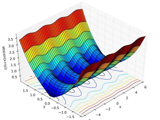 Keywords: Complex sin abs 01 Pengo.svg en abs sin z own based on Complex sine svg by Dave Farrance public domain Pengo 2010-09-14 sin z <gallery> File Complex_sin_abs_01_Pengo svg abs File Complex_sin_real_01_Pengo svg real File Complex_sin_imag_01_Pengo svg imag File Complex_sin_angle_01_Pengo svg angle </gallery> Source code Created with Matplotlib Based on File Complex sine svg by Dave Farrance <source lang python > /usr/bin/env python This generates four graphs for sin z Origin Peter Halasz 2010-09-14 Enhanced Ika 2013-07-23 import numpy as np from pylab import from mpl_toolkits mplot3d import Axes3D graphs 'abs' abs 'real' real 'imag' imag 'angle' angle for gr in graphs ax Axes3D figure azim -135 elev 45 X arange -2 pi 2 pi pi/12 Y arange -2 2 pi/12 X Y meshgrid X Y fn graphsgr Z fn sin X + Y 1j abs real imag angle angle range -pi pi ax plot_surface X Y Z rstride 1 cstride 1 cmap cm jet ax contour X Y Z zdir 'z' offset np min Z ax set_xlabel x ax set_ylabel y ax set_zlabel gr + ' sin x+iy ' plt savefig complex_sin_ + gr + _01_Pengo svg </source> Sine function Images with Python source code