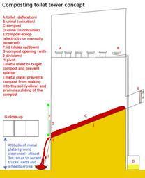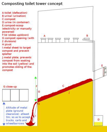 | Keywords: Composting toilet tower concept.png  en A schematic of the composting toilet tower concept conceived by KVDP toilets defecation/urination are placed on the first floor accessible via ladder stairs or manual lift; a manual lift would also facilitate delivery of the sawdust ; this floor is located on a certain altitide so as to facilitate the emptying of the tower which will need to be done in the period of fertilisation the exact time depends on the local climate and the crops grown As emptying is thus only done once a year the section of the tower holding the compost would need to be made large enough to be able to store the entire generated excrement+sawdust for the intented population eg some 8 people Emptying can be done into a variety of vehicles carts and even wheelbarrows This is made possible due to the clever opening based on the Clivus multrum system and the attached metal plate below which can be rotated Also the flow of compost can be regulated trough regulating the opening via the lids F 3 lids are to be foreseen 1 for each part of the opening see G The compost-scoop can be manually powered eg by allowing to push it using the feet of several operators leg-muscles are generally stronger than arm-muscles Note that as mentioned at the File Composting_toilet_with_UrineDiversion-Dehydration jpg atleast 2 urine collection bins need to be used and they should be made of glass or transparent plastic Again if needed a black board can be placed behind the bins Note that just as with regular composting toilets sawdust needs to be added in the appropriate C/N carbon-nitrogen ratio to the faeces to obtain compost introduced via the defecation hole own KVDP 2010-01-22 Composting toilets Urine diversion |
