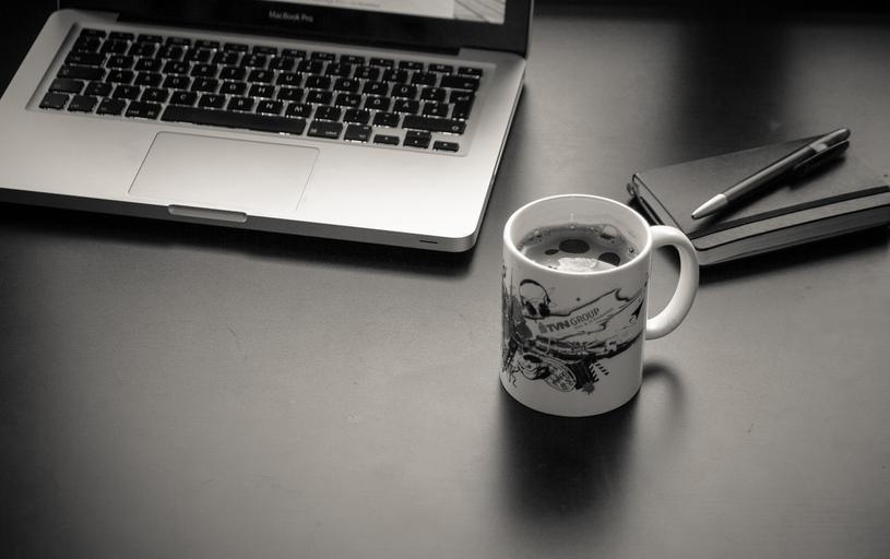 Keywords: computer laptop workplace mac macbook coffee cup coffee cup pen coolie notebook desk work home office black and white