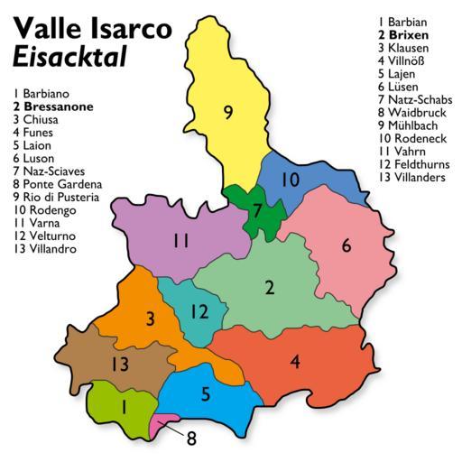 Keywords: Comuni valle isarco-gemeinden eisacktal.svg Karte der Gemeinden der Bezirksgemeinschaft Eisacktal Valle Isarco Südtirol Alto Adige Eigenes Werk Map of the municipalities of the Eisacktal Valle Isarco district South Tyrol Own work Mappa dei comuni della Valle Isarco Eisacktal Alto Adige Südtirol Lavoro proprio Legende / Legend / Leggenda Barbian - Barbiano Brixen - Bressanone Klausen - Chiusa Villnöß - Funes Lajen - Laion Lüsen - Luson Natz-Schabs - Naz-Sciaves Waidbruck - Ponte Gardena Mühlbach - Rio di Pusteria Rodeneck - Rodengo Vahrn - Varna Feldthurns -Velturno Villanders - Villandro User Mortadelo2005 Image Comuni valle isarco-gemeinden eisacktal png Created with Inkscape Maps of South Tyrol
