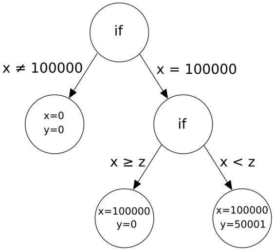 | Keywords: Concolic testing example.svg en The execution path tree searched by concolic testing on the C source code example in en Concolic testing The x and y values in the leaf nodes indicate test cases and the edges are labelled with path conditions own Dcoetzee 2009-11-09 cc-zero Algorithms |
