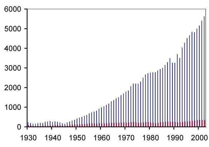 Keywords: ConcreteProduction.jpg Diagram showing the production of concrete million cubic metres from 1930 to 2002 World production in blue USA production in red Created by JohnM 2006-05-06 own assumed JohnM Concrete Production diagrams
