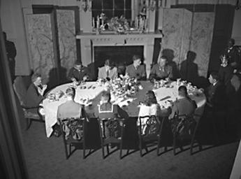 | Keywords: blackandwhite monochrome black and white Servicemen at Sunday Dinner with Governor at Executive Mansion, Raleigh, NC; Gov. Broughton and family entertain 2 soldiers, 2 marines, and 2 sailors for Sunday dinner April 1944. From Conservation and Development Department, Travel and Tourism photo files, State Archives of North Carolina. Servicemen at Sunday Dinner with Governor at Executive Mansion, Raleigh, NC; Gov. Broughton and family entertain 2 soldiers, 2 marines, and 2 sailors for Sunday dinner April 1944. From Conservation and Development Department, Travel and Tourism photo files, State Archives of North Carolina. |