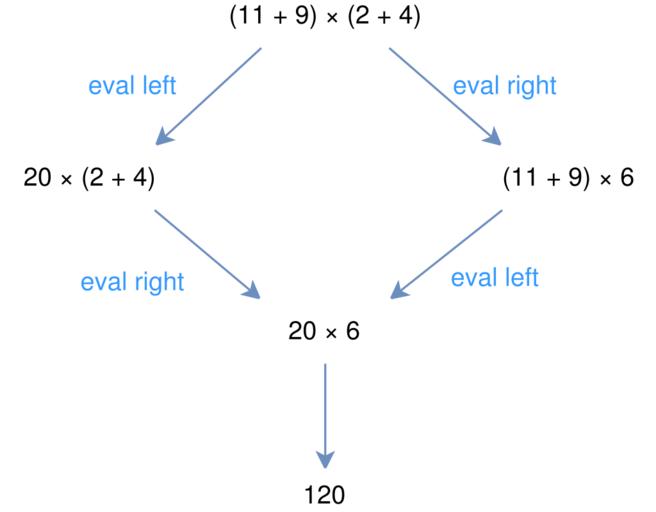 | Keywords: Confluence example expression.svg en Confluence example expression ‹ 11 + 9 × 2 + 4 2016-12-30 own Cedar101 other versions \begin array rcccl \color MidnightBlue \text eval left 11+9 \times 2+4 \color MidnightBlue \text eval right \\ \color MidnightBlue \swarrow \color MidnightBlue \searrow \\ 20\times 2+4 11+9 \times 6\\ \color MidnightBlue \searrow \color MidnightBlue \swarrow \\ \color MidnightBlue \text eval right 20 \times 6 \color MidnightBlue \text eval left \\ \color MidnightBlue \downarrow \\ 120 \\ \end array cc-zero Term rewriting systems |