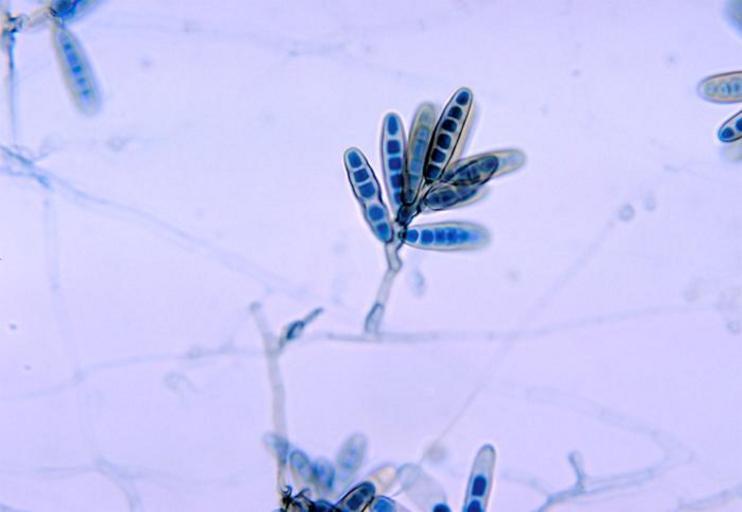 Keywords: Conidiophore of the fungus Bipolaris hawaiiensis PHIL 4338 lores.jpg This micrograph reveals a conidia-laden conidiophore of the fungus Bipolaris hawaiiensis Bipolaris spp are known to be one of the causative agents of the fungal illness phaeohyphomycosis which can be superficially confined to the skin or systemically disseminated and involve the brain lungs and bones Content Providers s CDC Creation Date 1971 Copyright Restrictions None - This image is in the public domain and thus free of any copyright restrictions As a matter of courtesy we request that the content provider be credited and notified in any public or private usage of this image http //phil cdc gov/phil_images/20030728/9/PHIL_4338_lores jpg PD-USGov Fungal morphology and anatomy Microscopic images of fungi |