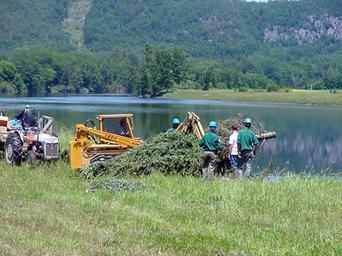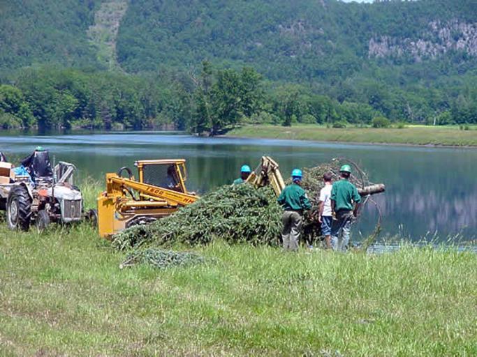 Keywords: Connecticut River restoration Farilee VT1.jpg Workers along the Connecticut River as it passes through Fairlee Vermont United States During the summer of 2002 a restoration project aimed at restoring a severely eroded riverbank utilized overgrown Christmas trees to create a revetment at the work site The trees were eventually planted with various aquatic plant life to help further trap sediment and prevent erosion See http //www epa gov/region1/eco/ctriver/ctriver_sustainable_riverbanks html Personnel travaillant à la restauration des berges sévèrement érodées de la rivière Connecticut Fairlee Vermont États-Unis l'été 2002 Ici des résineux sont apportés sur les berges Leurs branches serviront à emprisonner les matériaux issus de l'érosion et à stabiliser cette érosion de la berge pour favoriser une revégétalisation et une reprise de la vie aquatique http //www epa gov/region1/eco/ctriver/ctriver_sustainable_riverbanks html United States Environmental Protection Agency summer 2002 Public domain PD-USGov PD-USGov-EPA 2002 in Vermont Christmas tree farms Connecticut River in Vermont Environmental restoration |