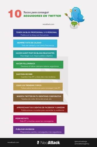| Keywords: seguidores twitter trucos ventas blog web perfil posicionmaiento visibilidad calidad followers infografia post neoattack.com/trucos-twitter-seguidores-visibilidad-clien... Trucos para Conseguir Seguidores en Twitter En el apartado de trucos para conseguir seguidores en Twitter te voy a contar 10 trucos que harán que aumentes tus seguidores rápidamente. De todas formas, si quieres Conseguir Seguidores Gratis rápidamente te recomiendo este pedazo de post de sugeralia “Cómo conseguir Seguidores en Twitter Gratis”. En él te enseñarán a conseguir más de 5.000 seguidores en pocos meses. Imprescindible si acabas de empezar o no tienes una gran comunidad. 1. Tener un blog personal y/o profesional Sin duda el mejor truco para aumentar tu comunidad es tener un blog personal/profesional. Publicar en tu blog con frecuencia te reportará un aumento de seguidores en Twitter además de en otras redes sociales, y cuanta más gente lea ese blog, más seguidores conseguirás y mayor notoriedad tendrás tanto online como offline. Para conseguir aumentar tus seguidores en Twitter necesitarás conseguir tráfico a tu blog y para eso lo mejor es aumentar las visitas a tu blog posicionando tus artículos. 2. Hacer Tuits de calidad Siempre que tuitees algo debe ser de calidad. Lee cada artículo que tuitees e intenta hacerlo con frecuencia. Cuanta más frecuencia más seguidores conseguirás. Para conseguir una buena frecuencia de publicación lo ideal es usar la herramienta Twitterfeed. 3. Hacer guest-posts en blogs relevantes Publicar artículos en post de terceros te ayudará a darte a conocer entre el público objetivo de este blog además de algún enlace interesante. Cuanto mejores artículos publiques en estos blogs más llamarás la atención de su comunidad y más seguidores obtendrás de esta. 4. Hacer Followback Es una truco que siempre funciona. Haz followback y conseguirás seguidores rápidamente, aunque estos normalmente no serán de mucha calidad. 5. Dar para recibir En twitter, al igual que la mayoría de las redes sociales, la gente es muy agradecida y si tu das, el resto siempre te devuelven. Da follow fridays (#FF): Para recomendar otras cuentas a tu comunidad y que las sigan. Este truco hará que a ti también te recomienden y que aumentes tu comunidad. Haz favs y RT: Cuantos más favoritos y retuits hagas más fácil será que otros usuarios te los hagan a tí porque se molestarán en ver quien eres y en leerte. Usa este truco para ganar notoriedad. 6. Usar los trending topics Una buena forma de conseguir retuits y, en muchos casos seguidores, es publicar tuits de tendencia. Estos tuits suelen tener un mayor engagement y normalmente acaban siendo más retuiteados, lo que nos dará una mayor visibilidad y seguramente algunos seguidores. 7. Twitter en tu identidad corporativa Poner twitter en tu tarjeta de visita, en el pie de firma de tu email, en otras redes sociales y en todas las plataformas que puedas aumentará con toda seguridad tu número de seguidores en la red social del pajaro azul. 8. Aprovechar tus cuentas Facebook y LinkedIn Aprovecha tu presencia en otras redes sociales para potenciar tu perfil de Twitter. Comparte tu perfil o las url de tus tuits en estas otras redes para conseguir aumentar tu audiencia y que tus contactos de Linkedin y fans de Facebook te sigan en Twitter. 9. Pedir retuits Por pedir que no quede, y es que muchas veces el pedir un RT hace que consigamos que nos lo hagan. Eso sí, no te pases con esta técnica porque puedes acabar hartando a la gente. 10. Publicar un ebook Otra de los trucos para conseguir seguidores en Twitter es publicar un ebook. Un ebook siempre proporciona un caché y hace que aumenten tus seguidores si se difunde correctamente y es de interés para tu comunidad, claro está. neoattack.com/trucos-twitter-seguidores-visibilidad-clien... Trucos para Conseguir Seguidores en Twitter En el apartado de trucos para conseguir seguidores en Twitter te voy a contar 10 trucos que harán que aumentes tus seguidores rápidamente. De todas formas, si quieres Conseguir Seguidores Gratis rápidamente te recomiendo este pedazo de post de sugeralia “Cómo conseguir Seguidores en Twitter Gratis”. En él te enseñarán a conseguir más de 5.000 seguidores en pocos meses. Imprescindible si acabas de empezar o no tienes una gran comunidad. 1. Tener un blog personal y/o profesional Sin duda el mejor truco para aumentar tu comunidad es tener un blog personal/profesional. Publicar en tu blog con frecuencia te reportará un aumento de seguidores en Twitter además de en otras redes sociales, y cuanta más gente lea ese blog, más seguidores conseguirás y mayor notoriedad tendrás tanto online como offline. Para conseguir aumentar tus seguidores en Twitter necesitarás conseguir tráfico a tu blog y para eso lo mejor es aumentar las visitas a tu blog posicionando tus artículos. 2. Hacer Tuits de calidad Siempre que tuitees algo debe ser de calidad. Lee cada artículo que tuitees e intenta hacerlo con frecuencia. Cuanta más frecuencia más seguidores conseguirás. Para conseguir una buena frecuencia de publicación lo ideal es usar la herramienta Twitterfeed. 3. Hacer guest-posts en blogs relevantes Publicar artículos en post de terceros te ayudará a darte a conocer entre el público objetivo de este blog además de algún enlace interesante. Cuanto mejores artículos publiques en estos blogs más llamarás la atención de su comunidad y más seguidores obtendrás de esta. 4. Hacer Followback Es una truco que siempre funciona. Haz followback y conseguirás seguidores rápidamente, aunque estos normalmente no serán de mucha calidad. 5. Dar para recibir En twitter, al igual que la mayoría de las redes sociales, la gente es muy agradecida y si tu das, el resto siempre te devuelven. Da follow fridays (#FF): Para recomendar otras cuentas a tu comunidad y que las sigan. Este truco hará que a ti también te recomienden y que aumentes tu 