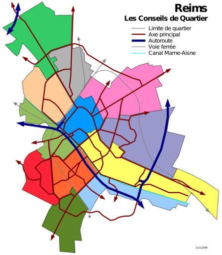 Keywords: Conseils quartier reims.svg fr Carte de la situation géographique des Conseils de Quartier de la ville de Reims en Map of the Quarter Councils in Rheims France Own Daiima 2008-10-30 Public domain Maps of Reims Quarters of Reims