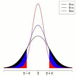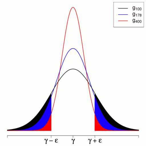 | Keywords: ConsistentEstimationFunction.png  en Illustrates a consistent estimator g_n for a paraemter gamma an increasing n leads to estimators with a smaller variance own Sigbert 2009-10-04 n xm <- -100 100 /100 xl <- -300 -100 /100 xr <- 100 300 /100 pdf ConsistentEstimationFunction pdf par mar c 2 5 0 5 0 5 0 5 plot xm dnorm xm sd 0 5 type l col red axes F xlim c -3 3 ylim c 0 0 8 lwd 2 xlab ylab lab <- c expression gamma~ - ~epsilon expression gamma expression gamma~ + ~epsilon axis 1 at c -3 -1 0 1 3 labels lab cex axis 2 lines xm dnorm xm sd 0 75 col blue lwd 2 lines xl dnorm xl type h lwd 2 lines xm dnorm xm lwd 2 lines xr dnorm xr type h lwd 2 lines xl dnorm xl sd 0 75 type h col blue lwd 2 lines xr dnorm xr sd 0 75 type h col blue lwd 2 lines xl dnorm xl sd 0 5 type h col red lwd 2 lines xr dnorm xr sd 0 5 type h col red lwd 2 legend topright legend c expression g100 expression g178 expression g400 col c black blue red lwd 2 cex 1 5 dev off and use GIMP to create a PNG file Statistical inference |