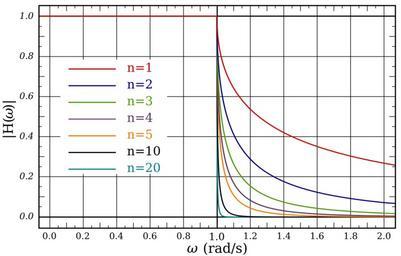 | Keywords: Constant-k Filter Gain with Multiple Half-Sections.svg constant-k filter composed of n half-sections for n 1 2 3 4 5 10 20 with a cutoff frequency of 1 rad/s The transmission parameters of a single half-section are given by <math>\gamma \alpha + i \beta \begin cases 0 + \sin -1 \frac \omega \omega_c \omega < \omega_c \\ \cosh -1 \frac \omega \omega_c + i \frac \pi 2 \omega > \omega_c \end cases </math> The gain of the whole filter is then <math>\mathrm H \omega \left e -\alpha \right n</math> own 2009-11-23 Inductiveload Mathematica Code <pre><nowiki> l 1; c 1; wc 1/Sqrtl c; gamw_ Piecewise I ArcSinw/wc w < wc ArcCoshw/wc + I Pi/2 w \GreaterSlantEqual wc gainw_ 1/ E Regamw; Plot Table gainw k k 1 2 3 4 5 10 20 w 0 2 PlotRange -> 0 1 </nowiki></pre> Constant-k filters |
