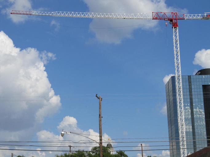 Keywords: construction crane crane telephone pole street lamp building site development architecture equipment dallas texas worker sky high urban city construction workers project build crane operator