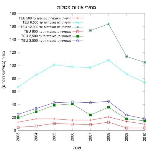 | Keywords: Container-ship-prices-He.svg en Container ship prices Data from pages 56-57 of cite book United Nations Conference on Trade and Development UNCTAD United Nations Conference on Trade and Development Review of Maritime Transport 2010 http //www unctad org/Templates/Download asp docid 14218 lang 1 intItemID 2068 2010 United Nations New York and Geneva PDF 978-92-1-112810-9 ; Gnuplot data file <pre> From RMT 2010 p 56 -57 2003 13 67 5 20 25 2004 18 86 7 29 34 2005 18 101 11 39 43 2006 16 98 10 41 44 2007 16 97 154 9 24 43 2008 21 108 164 13 36 45 2009 14 87 114 4 18 24 2010 10 74 105 4 15 18 </pre> ; Gnuplot script file <pre> set terminal svg enhanced font Sans size 600 600 set output container-ship-prices svg set title Container ship prices set samples 1001 high quality set border 31 linewidth 3 thin border set ylabel Price Million USD set xlabel Year set xtics rotate set key inside top left plot 'container-prices txt' using 1 2 with linesp lt 1 lc 1 title New geared 500TEU 'container-prices txt' using 1 3 with linesp lt 1 lc 4 title New gearless 6 500TEU 'container-prices txt' using 1 4 with linesp lt 1 lc 5 title New gearless 12 000TEU 'container-prices txt' using 1 5 with linesp lt 0 lc 1 title Used geared 500TEU 'container-prices txt' using 1 6 with linesp lt 0 lc 2 title Used geared 2 500TEU 'container-prices txt' using 1 7 with linesp lt 0 lc 3 title Used geared 3 500TEU set output flushes buffer </pre> ; Gnuplot command <tt> load 'container-prices-script txt'</tt> Container-ship-prices svg 2011-12-30 12 47 UTC Container-ship-prices svg Other fields Information field ucfirst location/i18n New York and Geneva ; Gnuplot data file <pre> From RMT 2010 p 56 -57 2003 13 67 5 20 25 2004 18 86 7 29 34 2005 18 101 11 39 43 2006 16 98 10 41 44 2007 16 97 154 9 24 43 2008 21 108 164 13 36 45 2009 14 87 114 4 18 24 2010 10 74 105 4 15 18 </pre> ; Gnuplot script file <pre> set terminal svg enhanced font Sans size 600 600 set output container-ship-prices svg set title Container ship prices set samples 1001 high quality set border 31 linewidth 3 thin border set ylabel Price Million USD set xlabel Year set xtics rotate set key inside top left plot 'container-prices txt' using 1 2 with linesp lt 1 lc 1 title New geared 500TEU 'container-prices txt' using 1 3 with linesp lt 1 lc 4 title New gearless 6 500TEU 'container-prices txt' using 1 4 with linesp lt 1 lc 5 title New gearless 12 000TEU 'container-prices txt' using 1 5 with linesp lt 0 lc 1 title Used geared 500TEU 'container-prices txt' using 1 6 with linesp lt 0 lc 2 title Used geared 2 500TEU 'container-prices txt' using 1 7 with linesp lt 0 lc 3 title Used geared 3 500TEU set output flushes buffer </pre> ; Gnuplot command <tt> load 'container-prices-script txt'</tt> own Haus derivative work Itzuvit <span class signature-talk >talk</span> Hebrew Itzuvit Container-ship-prices svg Cc-zero Original upload log This image is a derivative work of the following images File Container-ship-prices svg licensed with Cc-zero 2011-03-05T03 33 11Z Haus 600x600 14726 Bytes <nowiki>use sans font</nowiki> 2011-03-04T18 21 21Z Haus 600x600 14753 Bytes <nowiki>fix typo </nowiki> 2011-03-04T18 13 35Z Haus 600x600 14752 Bytes <nowiki>Tweaking output</nowiki> 2011-03-04T18 12 21Z Haus 600x600 14749 Bytes <nowiki>Tweaking options</nowiki> 2011-03-04T18 09 54Z Haus 600x600 14749 Bytes <nowiki>Tweaking options</nowiki> 2011-03-04T17 57 19Z Haus 300x300 14389 Bytes <nowiki> en Container ship prices Data from pages 56-57 of cite book United Nations Conference on Trade and Development UNCTAD United Nations Conference on Trade and Develop</nowiki> Uploaded with derivativeFX Container ships UNCTAD XIII SVG diagrams in Hebrew |