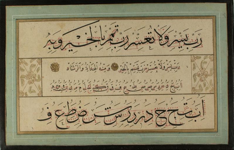 | Keywords: Containing Mehmed Şevki Efendi's calligraphies - Murakka (calligraphic album) - Google Art Project.jpg Top Arabic line reads رب يسر ولا تعسر رب تمم بالخير وبه 1829 Containing 602088 Mehmed Şevki Efendi's calligraphies 1829 /collection/sakp-sabanc-museum/artwork/murakka-calligraphic-album-containing-mehmed-sevki-efendis-calligraphies/574847/ Containing Mehmed Şevki Efendi's calligraphies /artist/mehmed-sevki-efendi/4127420/ 4127420 /collection/sakp-sabanc-museum/ Sakıp Sabancı Museum 479109 http //muze sabanciuniv edu/ 12/28/2011 6 21 34 PM /collection/sakp-sabanc-museum/artwork/murakka-calligraphic-album-containing-mehmed-sevki-efendis-calligraphies/574847/ 1863 1863 168 574847 False 1863 3/24/2012 5 16 41 AM 120-0216-MS Sakıp Sabancı Museum Ink colours and gold on paper pasted on cardboard 1860 1870 w258 x h168 mm 1863 False 1 5609756097561 Sakıp Sabancı Museum Object murakka-calligraphic-album-containing-mehmed-sevki-efendis-calligraphies Murakka calligraphic album m 258 special url_id NAGDVST4V0GoXw PD-old-70-1923 Google Art Project works by Mehmed Şevki Efendi Islamic calligraphy |