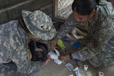 | Keywords: Continuing Promise 2015 150413-N-PD309-181.jpg en 150413-N-PD309-181 LA DEMOCRACIA April 13 2015 Left to right Army Spc Adrianna Maza a native of San Diego Calif assigned to Joint Base Myer-Henderson Hall Va and Army Sgt Janina Alaviz from North Bergen N J a veterinarian technician assigned to Public Health Command District Fort Hood Texas bandage a dog at The Belize Zoo Tropical Education Center as part of Continuing Promise 2015 Continuing Promise is a U S Southern Command-sponsored and U S Naval Forces Southern Command/U S 4th Fleet-conducted deployment to conduct civil-military operations including humanitarian-civil assistance subject matter expert exchanges medical dental veterinary and engineering support and disaster response to partner nations and to show U S support and commitment to Central and South America and the Caribbean U S Navy photo by Mass Communication Specialist Seaman Deven Leigh Ellis/Released <br>Unit U S Naval Forces Southern Command U S Fourth Fleet 2015-04-13 Petty Officer 3rd Class Deven Ellis https //www dvidshub net/image/1874310/continuing-promise-2015 150413-N-PD309-181 2015-04-15 10 01 LA DEMOCRACIA BZ PD-USGov-Military-Navy Joint Base Myer-Henderson Hall Fort Hood Texas Images from DoD uploaded by Fæ |