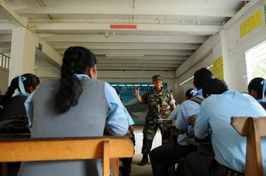 Keywords: Continuing Promise in Guyana DVIDS130401.jpg en Lt Cmdr Celeste Santana a member of the medical team embarked aboard the amphibious assault ship USS Kearsarge gives children at the Santa Rosa Secondary School a preventive medicine health lecture Kearsarge is supporting the Caribbean phase of Continuing Promise 2008 an equal-partnership mission between the United States Canada the Netherlands Brazil Nicaragua Colombia Dominican Republic Trinidad and Tobago and Guyana 2008-11-19 https //www dvidshub net/image/130401 081119-N-+++++-050 2008-11-21 22 48 SANTA ROSA GY PD-USGov-Military-Navy USS Kearsarge LHD-3 Images from DoD uploaded by Fæ |