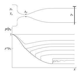 | Keywords: Converging-diverging nozzle, pressure distribution during acceleration of flow.svg en The pressure distribution along a pipe with converging-diverging section for various cases of decreasing back pressure 2015-02 own Olivier Cleynen other versions cc-zero Uploaded with UploadWizard SVG physics Convergent-divergent nozzles |
